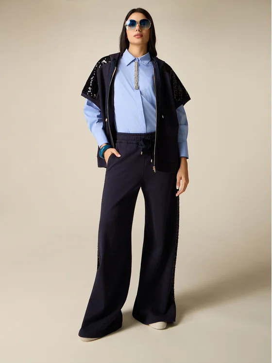 Pantaloni palazzo realizzati in jersey felpato di cotone; bande laterali con ricamo full paillettes; vita elasticizzata con coulisse regolabile e terminali metallici, tasche laterali inserite nei fianchi, possibilità di abbinarli alla felpa coordinata; MADE IN ITALY.