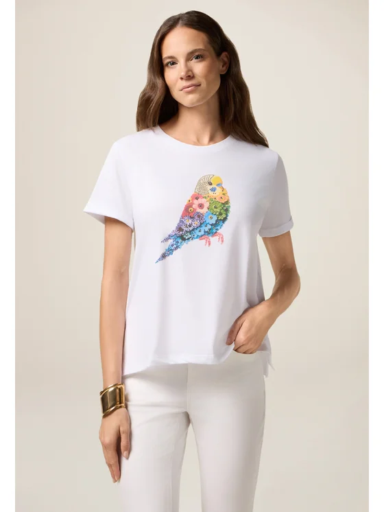T-shirt realizzata in jersey 100% cotone; stampa davanti impreziosita da applicazioni termoadesive; scollatura tonda e maniche corte con risvolto.