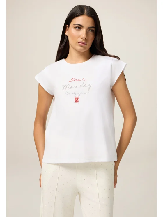 T-shirt in jersey di cotone con ricamo lettering davanti; scollatura tonda e maniche corte; MADE IN ITALY.