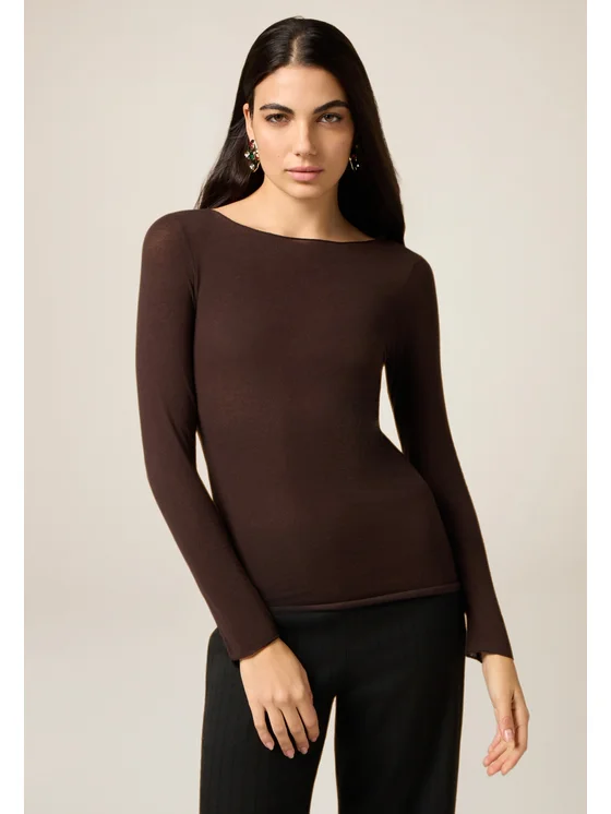 T-shirt in maglia fine misto cashmere; vestibilità aderente; scollatura a barchetta e maniche lunghe.
