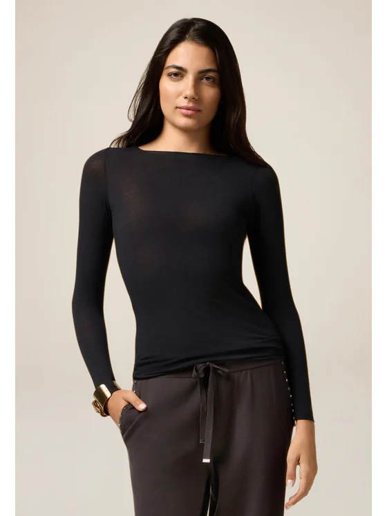 T-shirt in maglia fine misto cashmere; vestibilità aderente; scollatura a barchetta e maniche lunghe.