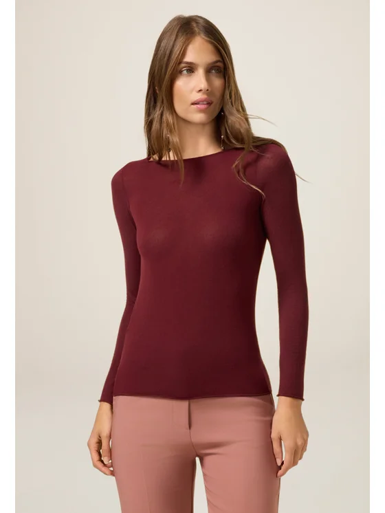 T-shirt in maglia fine misto cashmere; vestibilità aderente; scollatura a barchetta e maniche lunghe.
