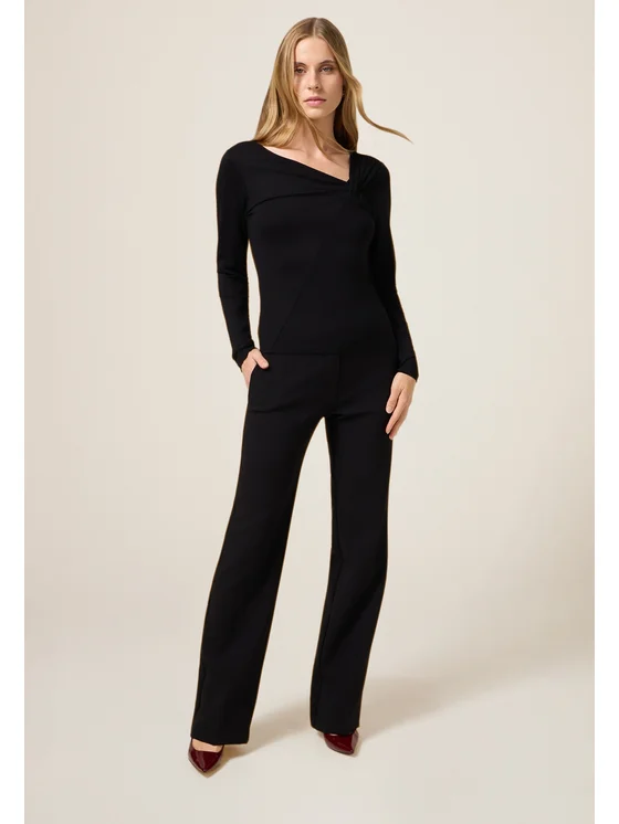 T-shirt realizzata in jersey misto viscosa; vestibilità slim con scollatura asimmetrica davanti; maniche lunghe.