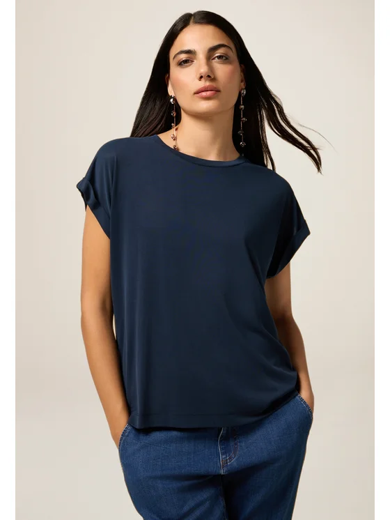 T-shirt in jersey misto modal; vestibilità regular; maniche corte con risvolto sul fondo, scollatura girocollo.