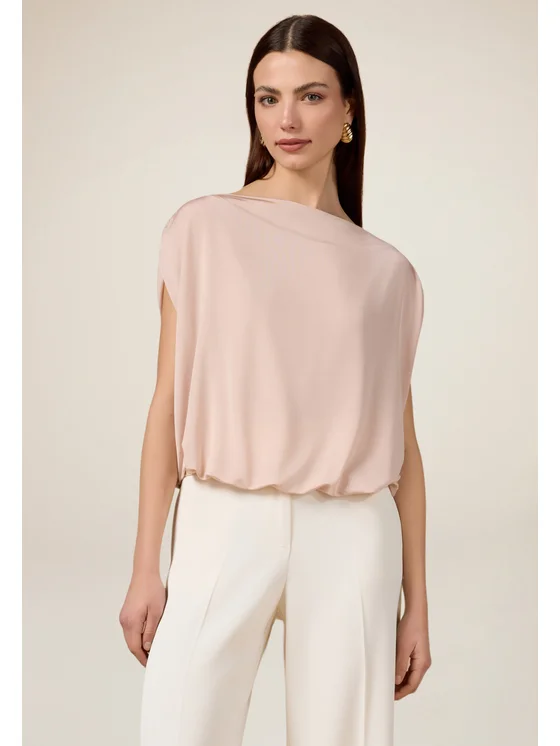T-shirt in tessuto misto viscosa; vestibilità boxy con drappeggio; scollatura a barchetta, maniche corte a kimono; MADE IN ITALY.