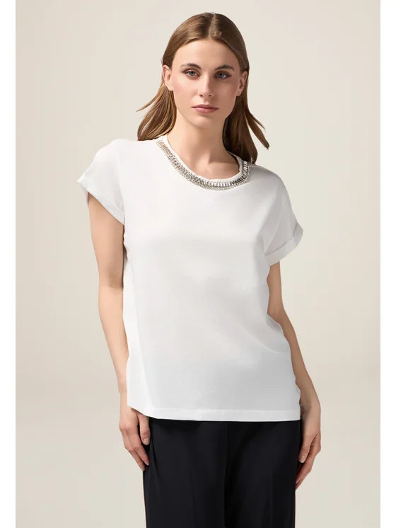 T-shirt in jersey di cotone; vestibilità regular con ricamo in pietre crystal; maniche corte con risvolto; MADE IN ITALY.