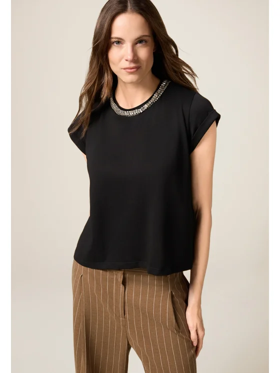 T-shirt in jersey di cotone; vestibilità regular con ricamo in pietre crystal; maniche corte con risvolto; MADE IN ITALY.