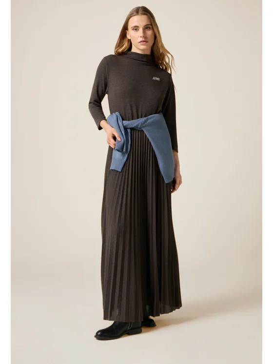 Vestito flare realizzato in jersey misto viscosa; lunghezza midi con gonna a lavorazione plissé; collo dolcevita, maniche lunghe; spilla lettering in metallo, staccabile. MADE IN ITALY.