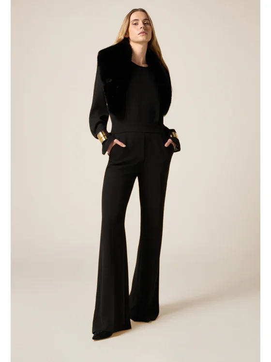 Tuta realizzata in fluido tessuto crêpe; pantaloni flared a vita alta, con piega stirata lungo le gambe; maniche lunghe ornate da bracciali dorati, removibili; MADE IN ITALY.