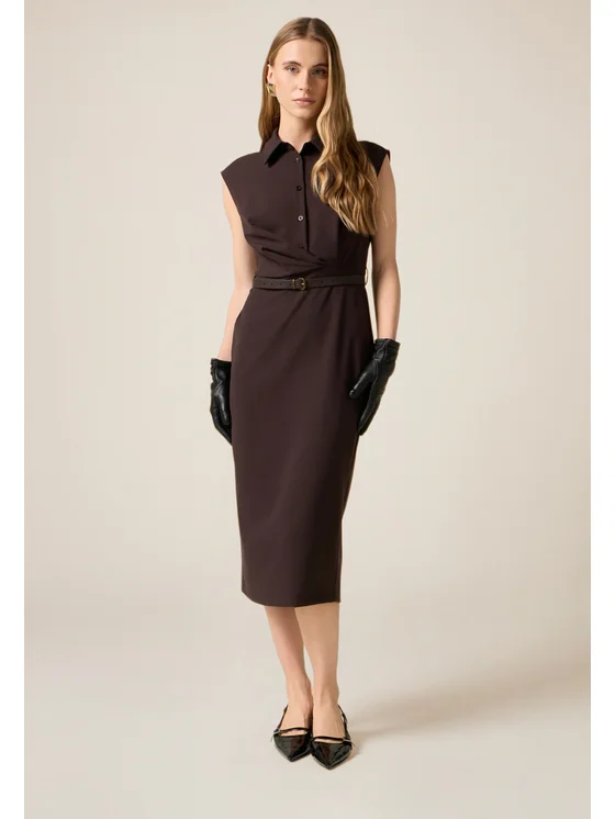 Vestito chemisier realizzato in tessuto fluido; lunghezza midi con cintura da stringere in vita; senza maniche, colletto classico e mezza chiusura con bottoni frontali; spacco posteriore. MADE IN ITALY.