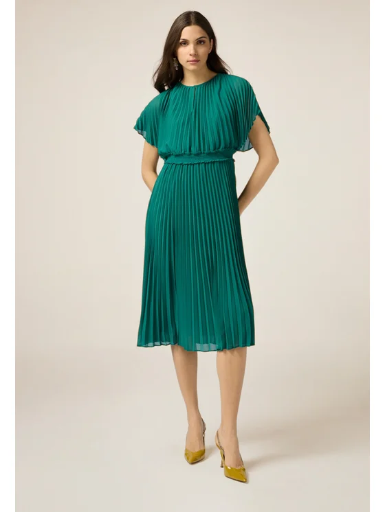 Vestito lungo realizzato in georgette tinta unita; lavorazione plissé all over, vita elasticizzata; maniche corte a kimono, scollatura tonda, cut-out a goccia davanti, fodera interna in jersey tono su tono.