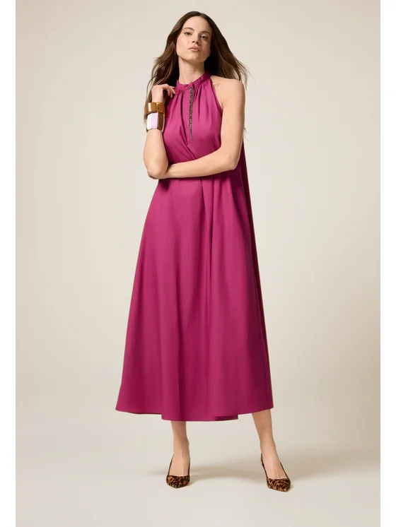 Vestito lungo dalla linea flared realizzato in popeline 100% cotone; scollatura all'americana con ricamo gioiello; senza maniche.