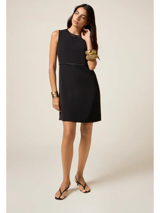 Vestito tubino realizzato in enver satin; senza maniche, tape in raso in vita; scollatura girocollo impreziosita da castoni cuciti a mano