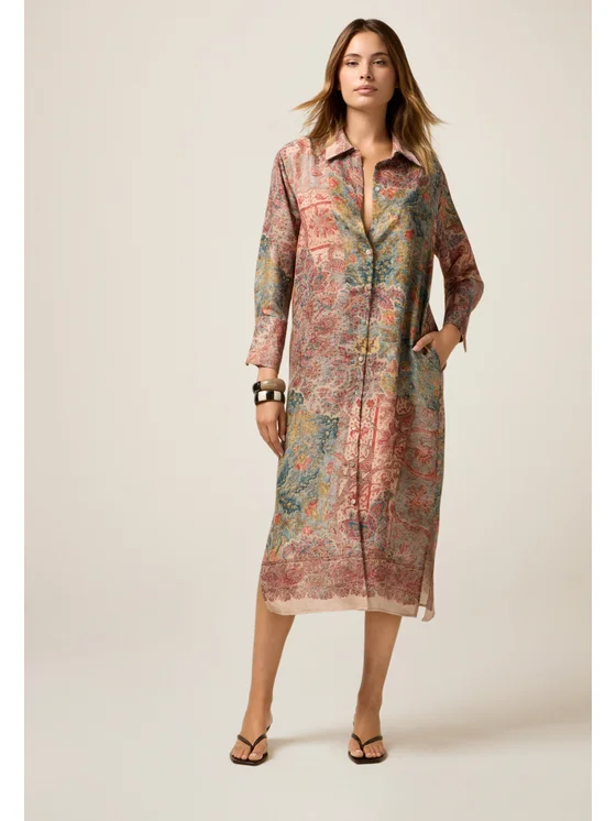 Vestito chemisier in fluido raso fantasia; lunghezza midi, chiusura con bottoni sul davanti e tasche laterali; MADE IN ITALY.