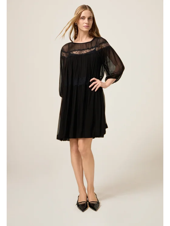Vestito flare realizzato in creponne di viscosa; maniche a tre quarti, scollatura girocollo; lavorazioni in pizzo sul corpino e sulla gonna; MADE IN ITALY.