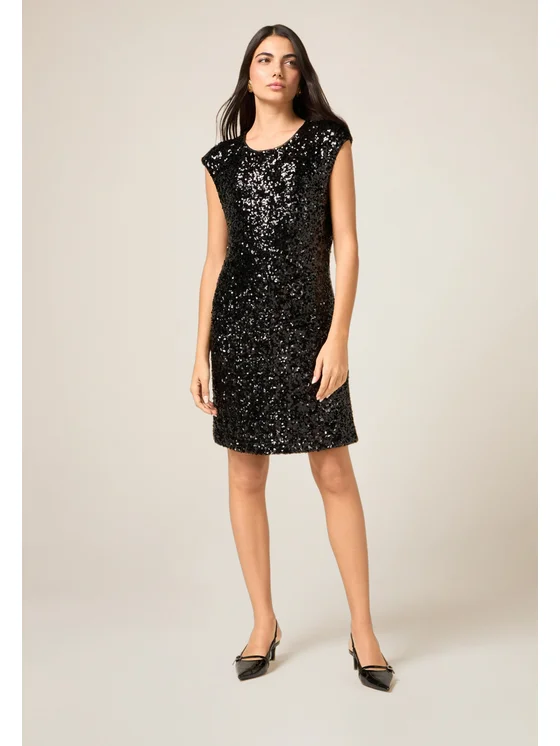 Vestito tubino realizzato in tulle con lavorazione full paillettes; chiusura a zip invisibile sulla schiena; maniche corte, scollatura girocollo.
