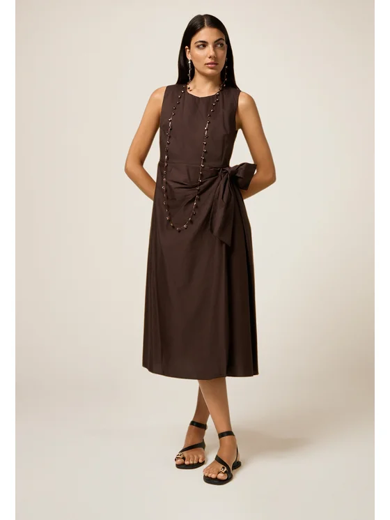Vestito dalla lunghezza realizzato in popeline misto cotone; drappeggio laterale con fiocco decorativo, chiusura con zip; senza maniche, scollatura girocollo.