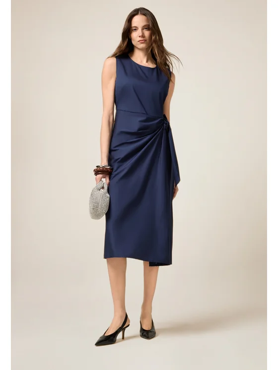 Vestito dalla lunghezza realizzato in popeline misto cotone; drappeggio laterale con fiocco decorativo, chiusura con zip; senza maniche, scollatura girocollo.