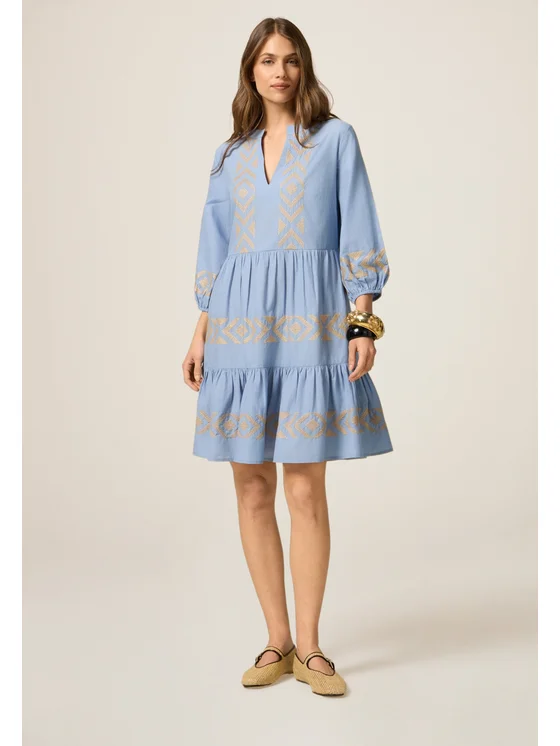 Vestito flare realizzato in popeline di cotone; maniche a tre quarti con elastico al fondo, scollatura a V; dettagli di ricami etnici a contrasto colore.
