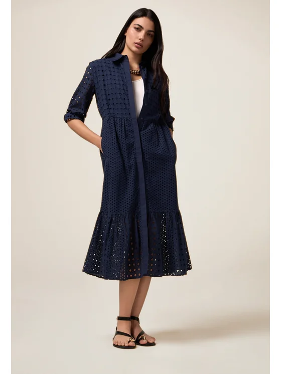 Vestito chemisier in pizzo sangallo 100% cotone a doppia lavorazione; lunghezza midi, maniche a tre quarti; colletto classico, chiusura frontale con bottoni.