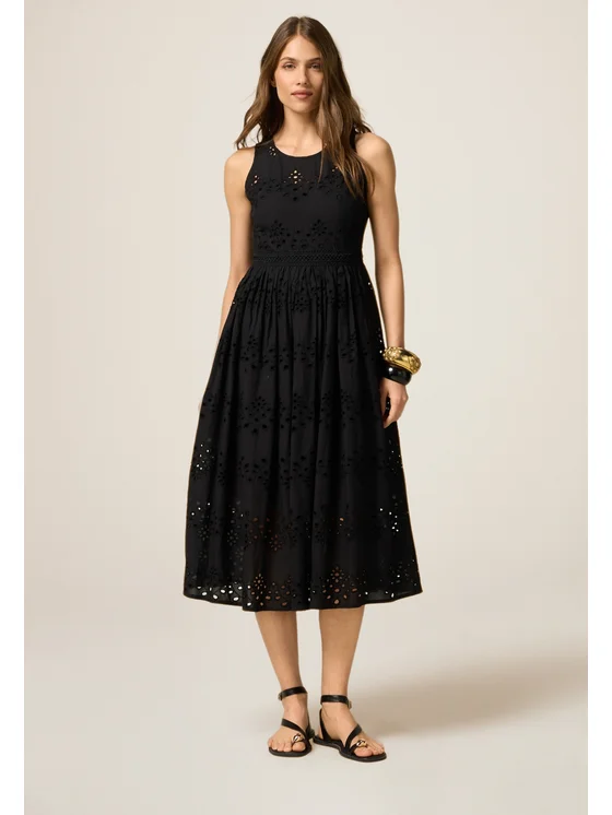 Vestito senza maniche realizzato in pizzo sangallo 100% cotone; lunghezza midi, linea flared; senza maniche, chiusura posteriore con zip invisibile.