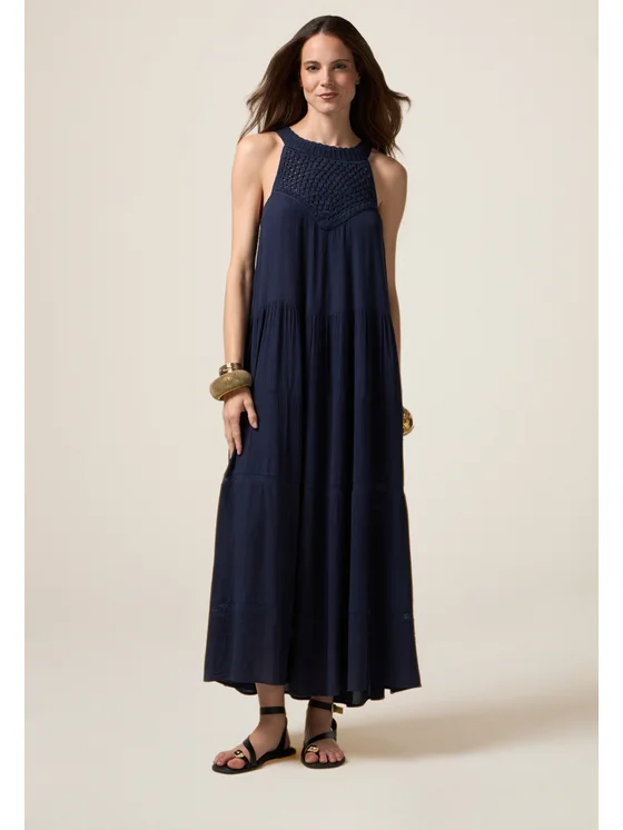 Vestito flare midi senza maniche realizzato in creponne di viscosa; linea ampia e fluida; parte alta in crochet tono su tono con scollatura all'americana, cut-out a goccia sulla schiena; il capo ha una vestibilità ampia, si consiglia di acquistare un taglia in meno.