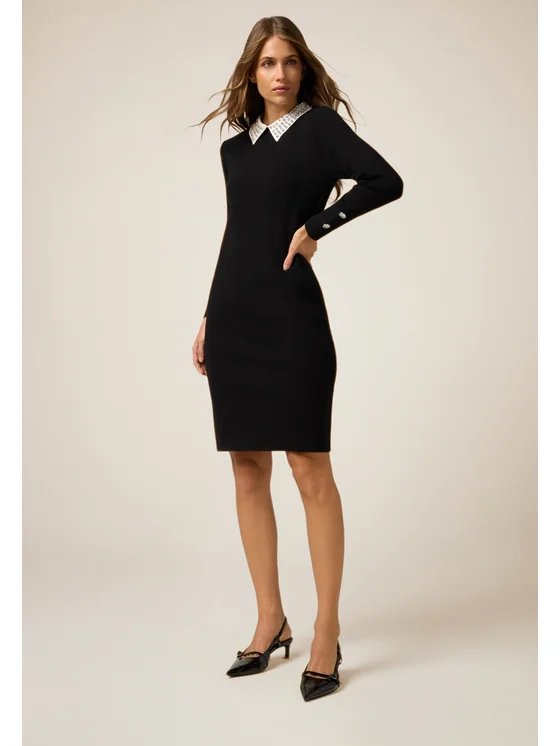 Vestito regular realizzato in jersey punto milano; maniche lunghe con decorazioni gioiello sul fondo; colletto effetto camicia ornato da applicazioni decorative.