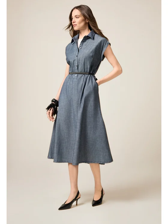 Vestito chemisier realizzato in tessuto cotone/lino ad effetto denim; lunghezza midi, linea ad A con cintura gioiello in vita; maniche corte a kimono, colletto e chiusura frontale a bottoni davanti.