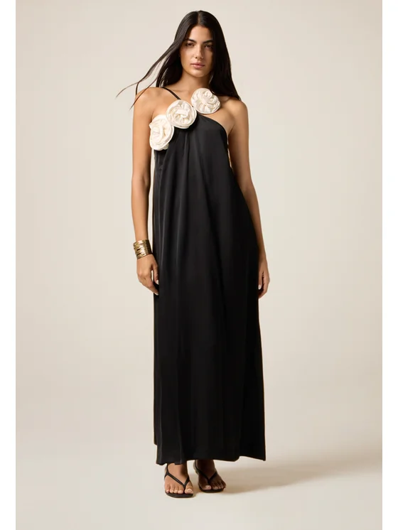 Vestito lungo realizzato in raso di viscosa; dettaglio di applicazioni floreali tridimensionali a contrasto colore; scollatura asimmetrica con un'unica spallina; MADE IN ITALY.