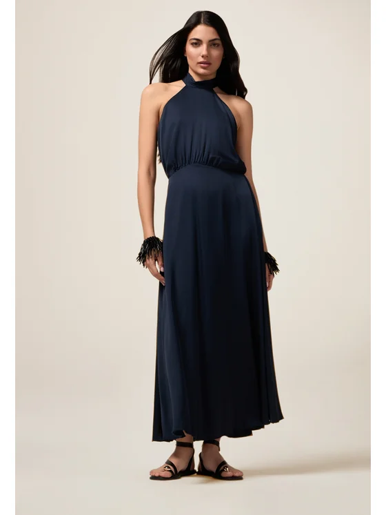 Vestito lungo dalla linea flare realizzato in raso di viscosa; scollatura all'americana con nastro da annodare a fiocco e maxi spilla a fiore, staccabile; vita elasticizzata internamente; MADE IN ITALY.