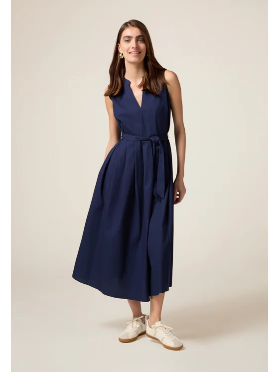 Vestito svasato senza maniche realizzato in popeline di cotone; lunghezza midi; scollatura a V, cintura da annodare in vita; il capo ha una vestibilità ampia, si consiglia di acquistare un taglia in meno.