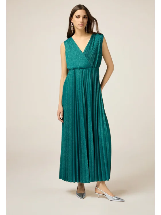 Vestito realizzato in tessuto lurex a lavorazione plissé all over; parte alta ad incrocio, che crea la scollatura a V; nastro sottile che annoda a fiocco sulla schiena, fodera interna in jersey tono su tono.