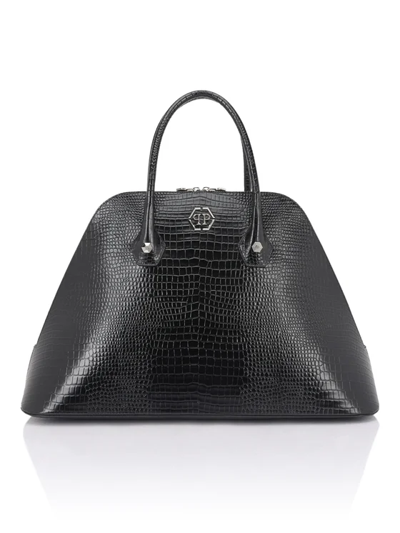 Equlibrio, praticità e stile. Ecco le caratteristiche della nuova borsa a mano creata da Pilipp Plein per la nuova stagione. Scopri tutti i dettagli. Pelle stampata coccodrillo Patch con logo decora la borsa Doppio manico ad arco Chiusura con zip Interno foderato Misure Big