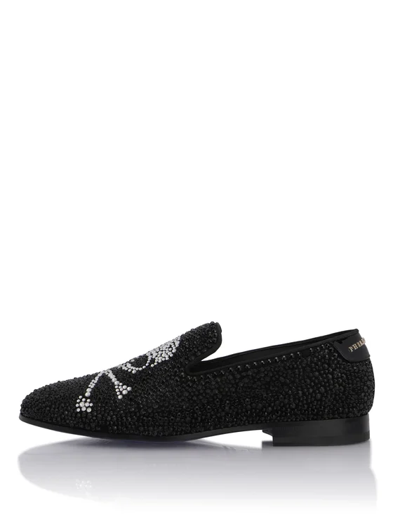 Il mocassino da sera è il must per la tua eleganza. Scopri la versione a pantofola rivisitata in stile Plein. Guarda i dettagli che fanno la differenza. Tomaia di suede ricoperta all over da cristalli Skull & Bones riprodotto sulla mascherina Profili di canneté Collaretto di vernice con lettering di metallo Suola di vero cuoio Battistrada con stampa a caldo dell'iconico logo Interno foderato di nappa Sottopiede di raso matelassè
