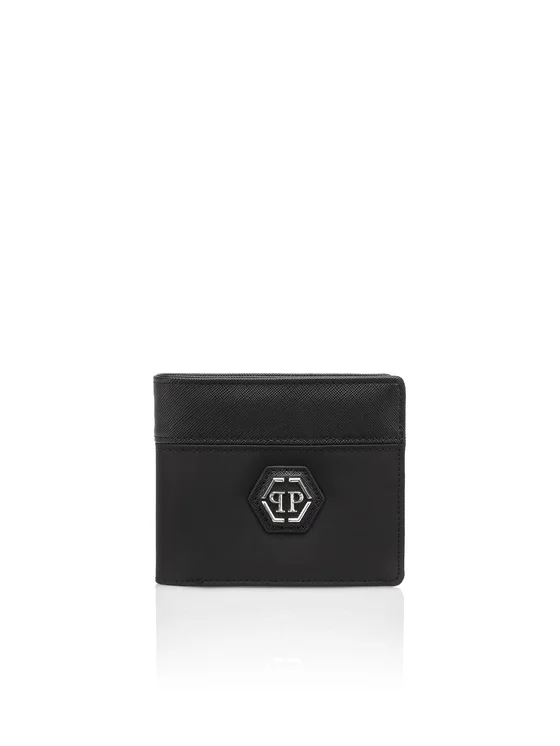 Aggiungi al tuo look un po' di stile Plein e scegli il portafogli giusto. Pelle saffiano e nylon Interno di pelle con scomparti per tessere PP Hexagon di metallo su patch di pelle saffiano cucito sul fronte Fodera di tessuto Misure: h 10 cm, w 11 cm (chiuso)