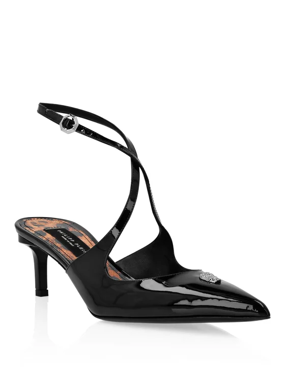 Mostra il tuo lato chic con le nuove decolleté con cinturino. Guarda i particolari. Tomaia di vernice Cinturino incrociato chiuso con fibbia Skull gioiello sulla mascherina Suola di vero cuoio Interno foderato Tacco rivestito cm 5,5