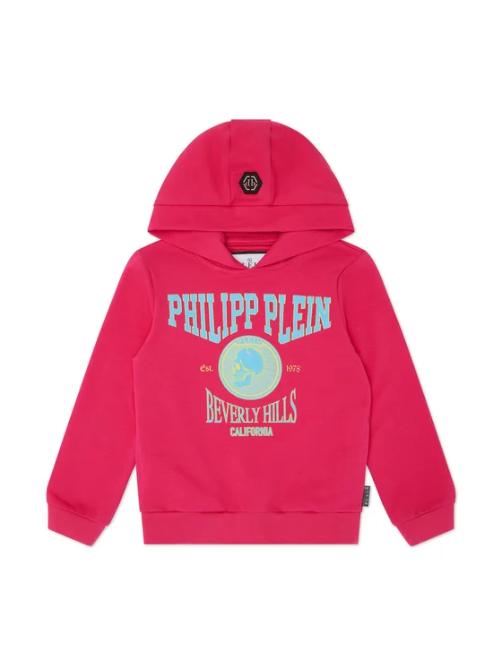 Comoda e colorata questa maglia jogging con cappuccio è realizzata in felpa di cotone. Tessuto in morbida felpa di cotone La maglia è decorata da lettering e pattern stampati sul fronte PP Hexagon su patch di pelle saffiano cucito sul cappuccio Bordi smacchinati a costina