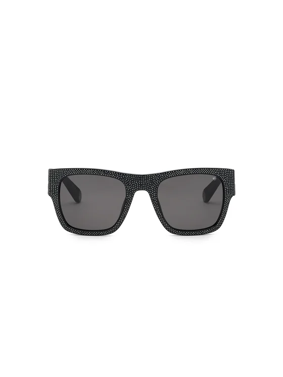 Scopri il modello di occhiale da sole destinato a diventare iconico. Montatura di acetato color nero lucido impreziosita da applicazioni di cristalli Aste di acetato caratterizzate da PP Hexagon stampato a rilievo Lenti grigio scuro Protezione 100% UVA