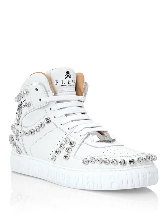 Sneakers hi-top Crystal con la tomaia di pelle stampata cervo impreziosita da applicazioni di cristalli incastonati. Il lettering ricamato sulla caviglia ricorda che il modello è in Limited Edition. La chiusura è regolata da lacci. Tutti i bordi sono imbottiti. La suola è di gomma antiscivolo e l'intersuola riporta il lettering del brand stampato a rilievo. L'interno è foderato e la soletta è estraibile.