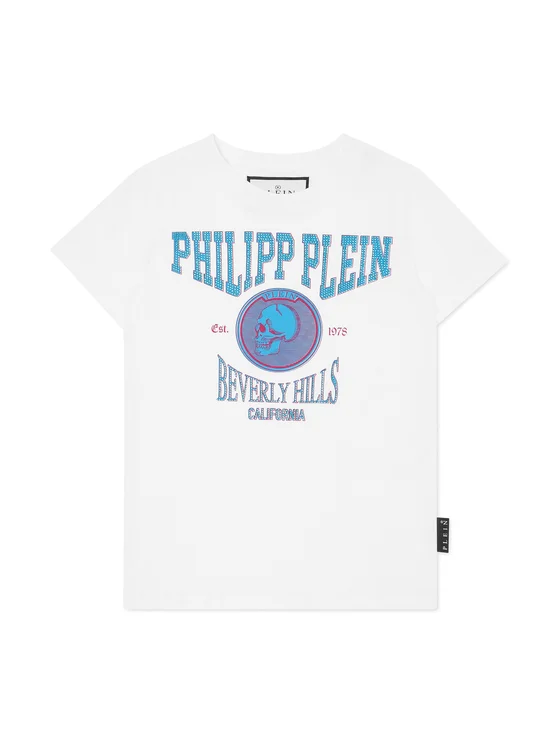 Scopri questa esclusiva t-shirt di cotone creata con stampe e decorazioni speciali. Guarda i dettagli. Tessuto di jersey di cotone Lettering e pattern stampati sul fronte e impreziositi da applicazioni di cristalli PP Hexagon su patch di pelle saffiano cucito sul carré Girocollo smacchinato a costina I bordi sono rifiniti a due aghi