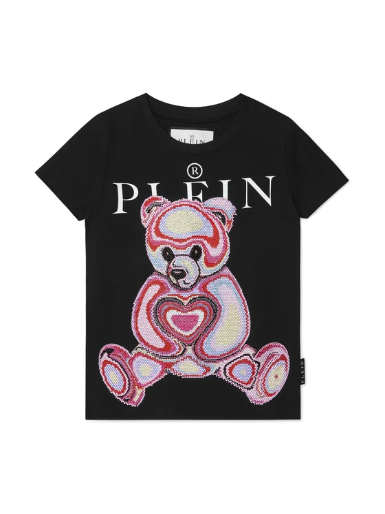 Aggiungi una nota di originalità ai tuoi outfit casual con questa t-shirt oversize di cotone. Guarda i dettagli. Tessuto di jersey di cotone Il fronte è decorato con Teddy Bear realizzato con applicazioni di cristalli colorati e la stampa del lettering del brand PP Hexagon su patch di pelle saffiano cucito sul carré Girocollo smacchinato a costina I bordi sono rifiniti a due aghi