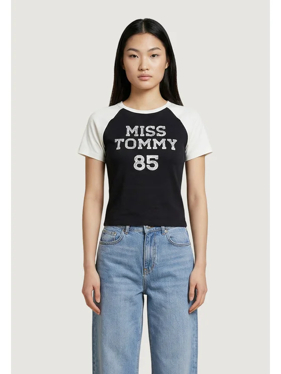 La t-shirt a maniche corte da donna Tommy Hilfiger Jeans DW0DW22536 unisce stile sportivo e comfort quotidiano. Realizzata con il 98% di cotone rigenerato e il 2% di elastam/lycra, offre una vestibilità morbida e leggermente elastica, ideale per accompagnare ogni movimento. Il design presenta maniche raglan a contrasto e una stampa frontale 'MISS TOMMY 85', che dona un tocco vintage e distintivo al capo. Perfetta per look casual e dinamici, questa t-shirt è una scelta sostenibile e di tendenza per la stagione primavera-estate.