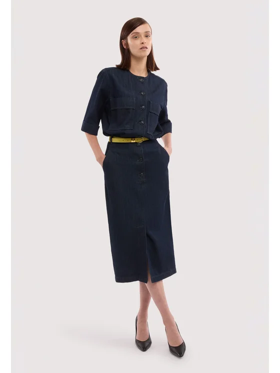Realizzato in denim; Tasche applicate sul davanti; Gonna a tubino con spacco frontale