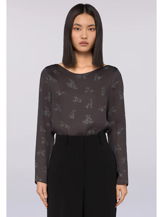 Realizzata in filato misto viscosa fluido; Scollo a barca; Stampa allover con motivi del levriero Trussardi; Vestibilità regular