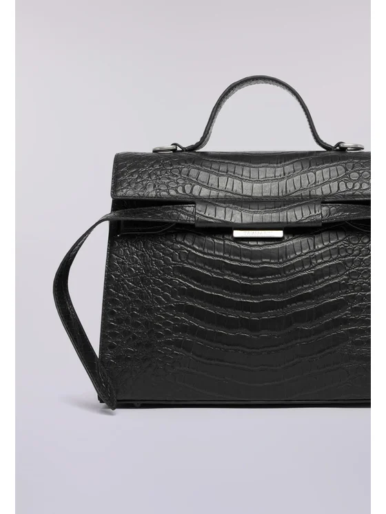 Realizzata in vera pelle stampa coccodrillo; Chiusura logata Trussardi con galvanica argento opaco; Tracolla regolabile e amovibile; Dimensioni in cm: 28 x 23 x 11