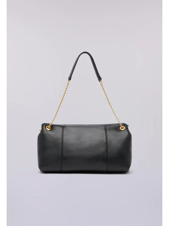 Realizzata in vera nappa; Tracolla con catena in galvanica oro; Portabile sia a tracolla che a spalla; Dimensioni in cm: 33 x 19 x 11
