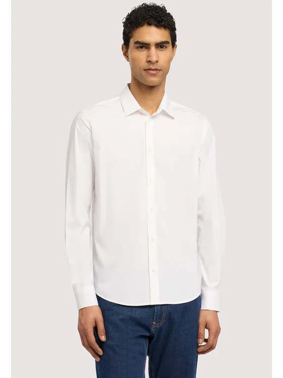 Popeline stretch; Slim fit con pinces laterali sul retro; Ricamo levriero Trussardi sul punto cuore; Collo classico