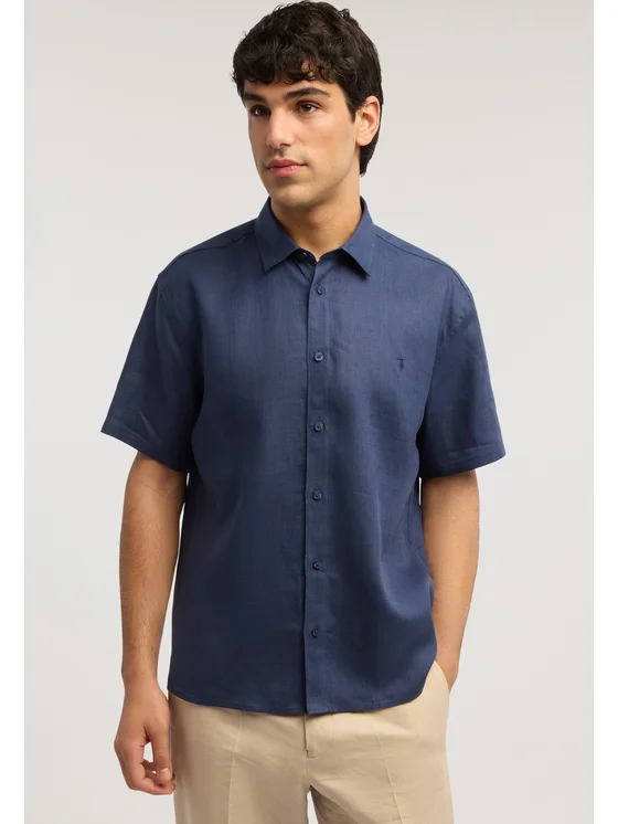 Tessuto in lino; Vestibilità regular fit a maniche corte; Ricamo levriero Trussardi sul punto cuore; Collo francese