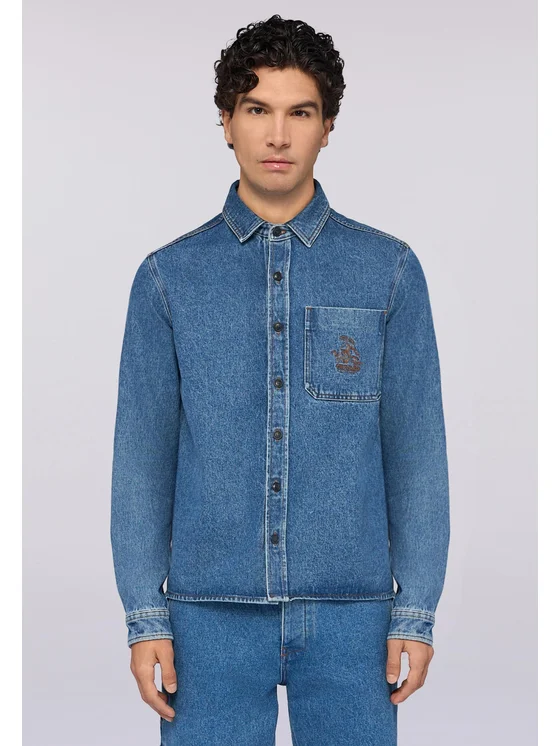 Denim blu stone washed autentico.; Relaxed fit con tasca sul punto cuore.; Ricamo Trussardi sulla tasca.; Collo classico con bottoni.