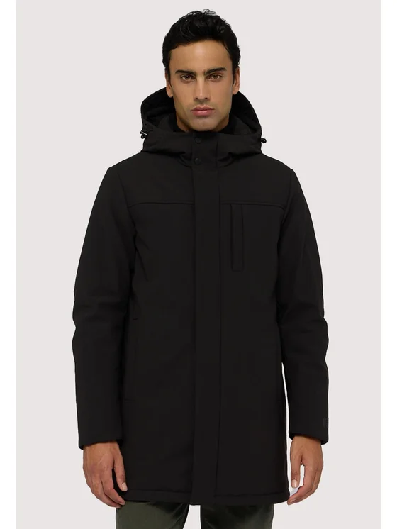 Realizzato in tessuto tecnico opaco DWR.; Cappuccio con coulisse e chiusura doppia con zip e bottoni magnetici.; Interno trapuntato con due tasche.; Vestibilità regular.
